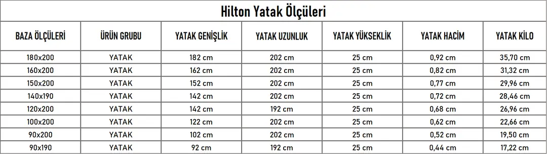 Yatak yüksekliği 24 cm olup, Rollpack sistemi ile paketlenmektedir. Yatak, formunu alması için 72 saate ihtiyaç duymaktadır. Kilim Mobilya, Hilton ile kaliteli bir uyku deneyimini daha ulaşılabilir hale getirmektedir. Ürün, tek kişilik ve çift kişilik seçenekleri ile farklı boyutlarda sunulmaktadır.